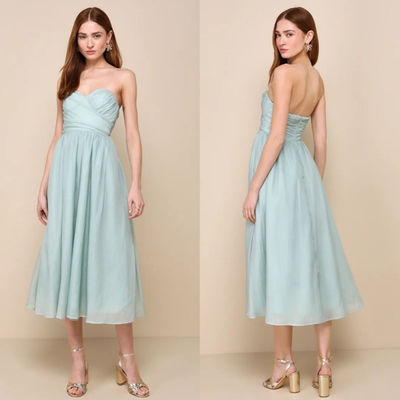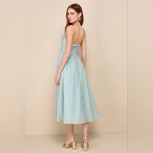 Lulus Fairytale Design Sage Green Organza Strapless A-Line Midi Dress L Wedding NWT. See all pictures for details. Currently SOLD OUT online.