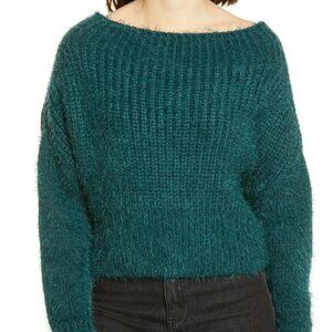 LULUS Feeling It Eyelash Knit Off the Shoulder Sweater, Size Medium Dark Emerald
