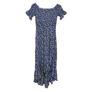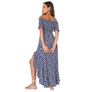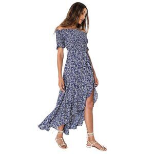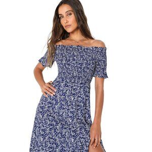Lulus Fleur-tation Navy Blue Floral Off Shoulder Smocked Midi Dress