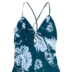 Lulus •Emerald Green •Floral Print •Cocktail •Sleeveless •Lace Back Details •Wedding Guest •Party •Chiffon •Lined Dress •V Neckline •Tie Front Detail •Keyhole Cutout at the Center •Empire Waist •Midi Dress