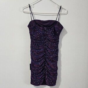 The Lulus Flirty Vibes Purple Multi Sparkly Ruched Bodycon Mini Dress will have your crush swooning! Slinky mesh fabric that flashes from blue to purple, with silver lurex threading and iridescent embellishments, shapes a straight neckline and a fitted bodice with hidden padding for extra support, supported by rounded spaghetti straps. Micro mini bodycon silhouette is accented with side ruching for a flattering fit. Hidden back zipper/clasp.