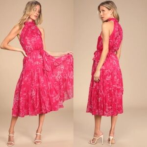 Lulus Float to You Hot Pink Floral Print Halter-Neck Tiered Midi Dress L Wedding