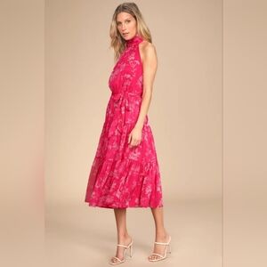 Lulus Float to You Hot Pink Floral Print Halter-Neck Tiered Midi Dress L Wedding NWOT. See all pictures for details.