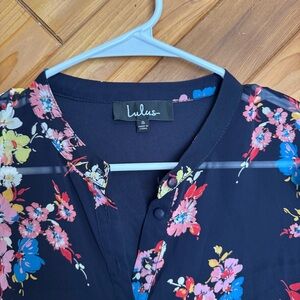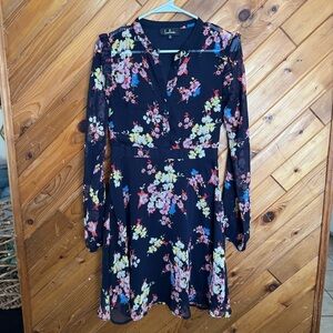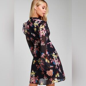 Elegant floral dress with vibrant colors on a black base. Perfect for any occasion.
