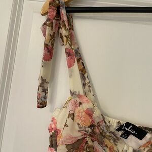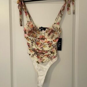 Chic floral bodysuit with tie straps. Sweetheart neckline. Perfect for any occasion.