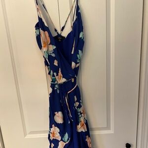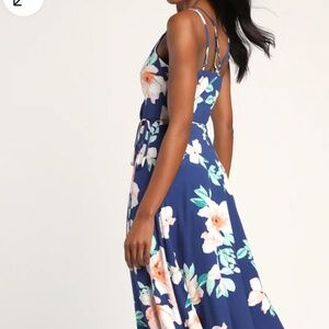 Lulus Blooming Bright Blue Floral Print High-Low Wrap Midi Dress! Lightweight woven fabric, with a vibrant floral print throughout, falls from two sets of adjustable spaghetti straps to shape a sleeveless darted bodice and a wrap silhouette that ends at a high-low hem.
