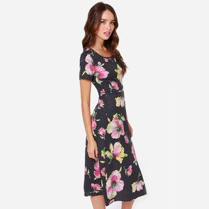 Charcoal grey woven fabric with floral blooms. Hits below the knee. Fitted waist. Hidden back zipper. The waist measures 12 inches across when flat (see last image). It fits tightly on a 25 inch waistline. I recommend for waists 24 inches or slimmer.