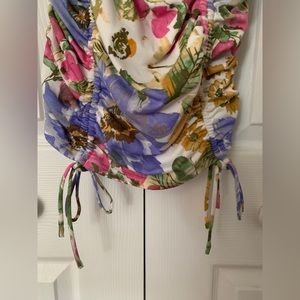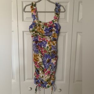 Vibrant floral mini dress. Ruched design with tie details. Perfect for summer outings.