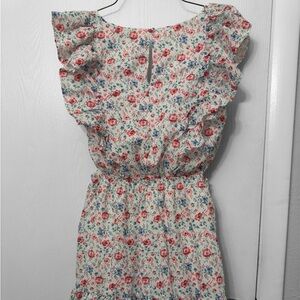 Elegant mini dress with floral pattern. Features ruffle sleeves and hem. Perfect for a stylish day out.