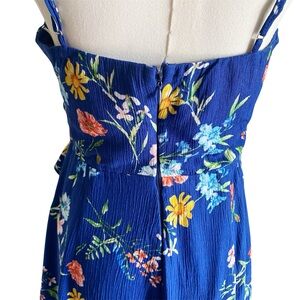 Features: Floral print. Cutout detail on bust. Ruffle details. Back zipper. Gauzey material. Adjustable straps.