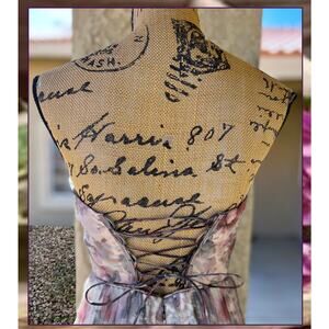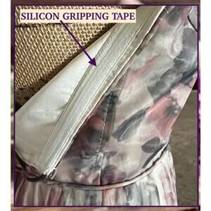 Elegant strapless maxi dress. Features a floral pattern. Perfect for special occasions.