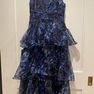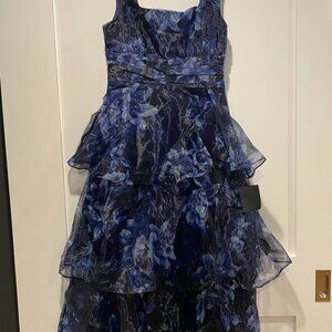Dramatic Glamour Navy Blue Floral Organza Tiered Midi Dress. New with Tags! Size S.
