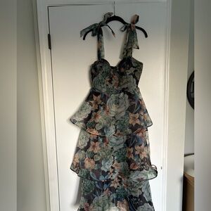 Chic high low dress with floral design. Features layered tiers and adjustable straps. Worn once- in perfect condition. Reviews say it runs small- chest area has no stretch, but otherwise fit like a M.