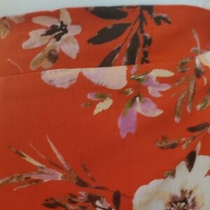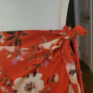 Chic floral wrap skirt. Features vibrant orange with white floral pattern. Perfect for casual outings.