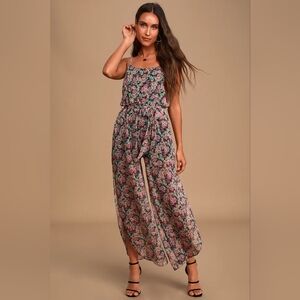 Lulus Flow With Me Black Floral Print Wide-Leg Jumpsuit Size Medium