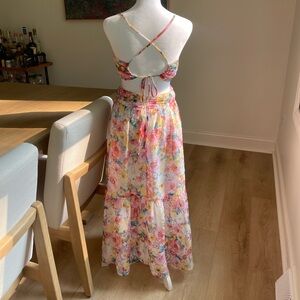 You'll be in a springtime fantasy when you've got the Lulus Flower Fields Pink Multi Floral Print Lace-Up Midi Dress! Lightweight chiffon, with a bright floral print and Swiss dot texture throughout, shapes spaghetti straps that crisscross and lace up the open back, supporting a bodice with a surplice neckline. A gathered waist (with subtle wraparound side cutouts) tops a two-tiered skirt that ends at a breezy midi hem. Hidden zipper/clasp at back.