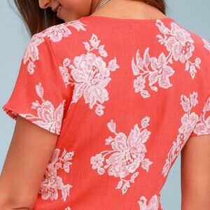 Lulus Flying High Coral Floral Print Short Sleeve Tie-front Crop Top Women's M