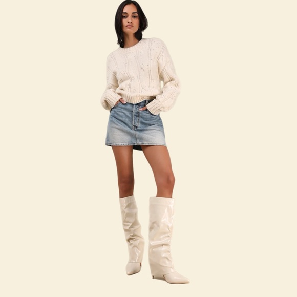 Women's Lulus fold-over knee-high boots in Bone color, size 6. These stylish stiletto boots feature a high heel height of 3.75 inches, made of faux leather material. With a sleek knee-high design and ivory color, these boots are a fashionable choice for any woman looking to elevate her outfit with a touch of sophistication. The Lulus brand ensures quality craftsmanship and a trendy style that is perfect for various occasions.