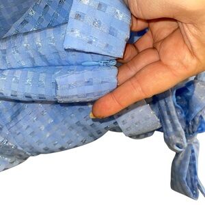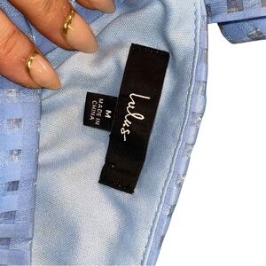 Lulus Forever Darling Blue Gingham Burnout Tie-Strap Mini Dress You're sure to capture plenty of hearts in the Lulus Forever Darling Blue Gingham Burnout Tie-Strap Mini Dress! Airy woven fabric boasts a gingham-inspired burnout fabric that shapes tying shoulder straps and a seamed bodice with folded trim. Fitted waist tops a circle skirt that finishes at a mini hem. Hidden zipper/clasp at side.