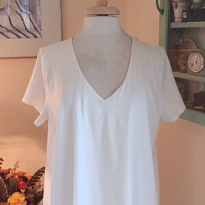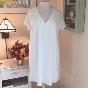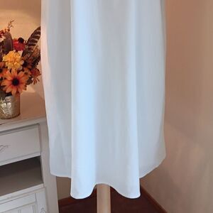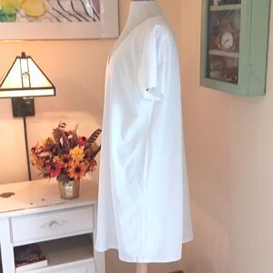 NWT. This is the " little white dress" you've been looking for. Longer than pictured. A light outer layer. Fully lined. Deep V and short sleeves. Pull over style. Size 1X measures 46 at chest, 60 at bottom hem. 37 long from shoulder to hem. Sophisticated and simply elegant.