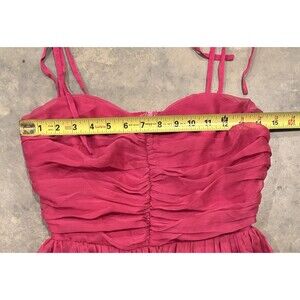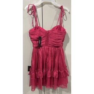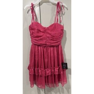 Fuchsia mini dress by Lulu's. Ruched bodice with sweetheart shape. Adjustable tie shoulder straps. Double-tier ruffle skirt for playful movement. Lightweight, airy fabric for easy wear.