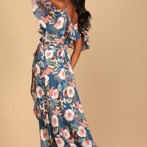 Lulu's Fully Bloomed Blue Floral Print Off-the-Shoulder Maxi Wrap Dress