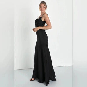 Lulus Gala Glamour Black Satin Backless Mermaid Maxi Dress Wedding Party. New without tags. Missing size tag. Adjustable spaghetti straps and a bodice with an elegant cowl neckline. See all pictures for details.