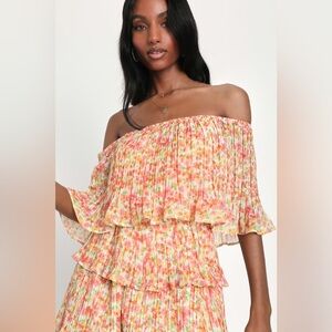 Lulus Gala Ready Peach Multi Floral Pleated Off-the-Shoulder Romper