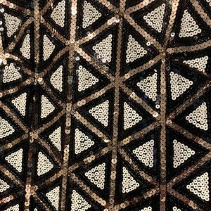 Mock neck, darted bust and stunning geometric sequined eye candy glam design in black white and gold over a basic black lining. The lining is slightly stretchy but the sequin overlay is not.