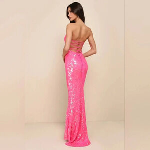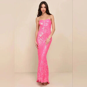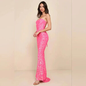 Lulus Glam Aura Hot Pink Iridescent Sequin Strapless Maxi Dress Prom Party NWOT. See all pictures for details. Size currently SOLD OUT online.