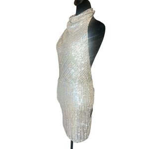 Lulus Glam Behavior Beige Silver Sequin Mock Neck Mini Dress Women’s M NWT