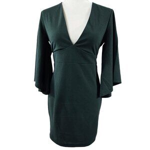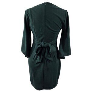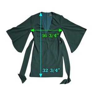 Good used condition, with no stains or tears. A dark green mini dress, with an attached tie waist. Has a low v-neck, bell sleeves, and a back zipper. Lined.
