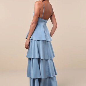 Lulus Going With Elegance Slate Blue Satin Tiered Gown - Size L