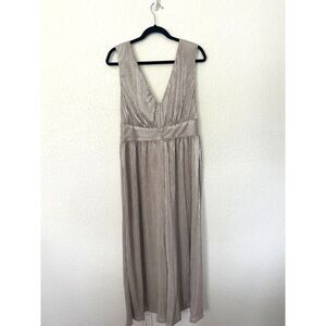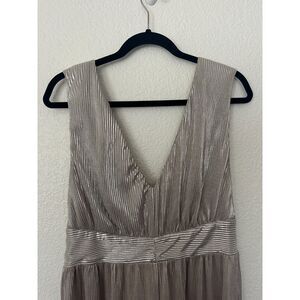 Elegant gold jumpsuit with a deep V-neck. Sleeveless design. Perfect for evening wear.