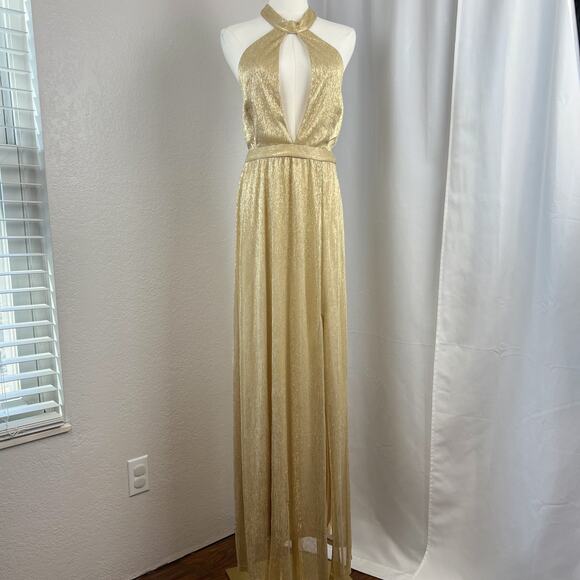 Elegant gold maxi dress with halter neckline. Features a keyhole front and flowing skirt. Gorgeous dress, but arrived too late for the event that I wanted to wear it at, and don’t attend that type of thing often enough to justify keeping it! Excellent used condition with no flaws/signs of wear