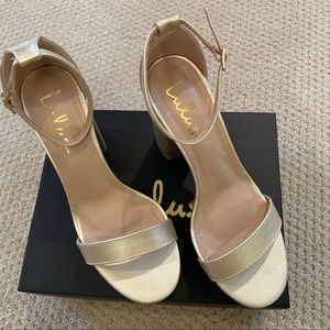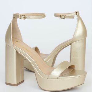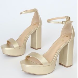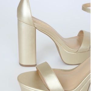 Elegant gold platform heels. Ankle strap design. Perfect for any occasion.