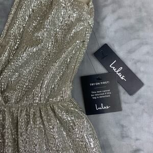 Keywords: Lulus dress, gold maxi dress, shimmer dress, formal dress, party gown, sleeveless dress, V neck dress, A line dress, evening gown, special occasion dress, gold dress small, metallic dress, Lulus formal dress