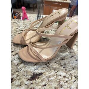 Elegant gold sandals with strappy design. Perfect for any occasion.