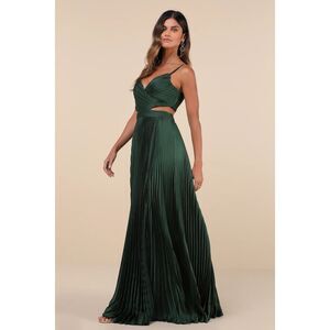 It will be clear just how glamorous you are in the Lulus Got the Glam Emerald Green Pleated Cutout Maxi Dress! Sleek woven satin shapes this dress that has adjustable spaghetti straps, a surplice neckline, and a fitted bodice. A back cutout peeks around the sides atop a banded waist and an accordion-pleated maxi skirt. Exposed silver zipper on the top and a hidden back zipper/clasp on the skirt.