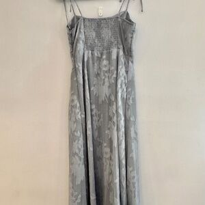 Elegant gray midi dress with floral pattern. Features spaghetti straps and a subtle slit.