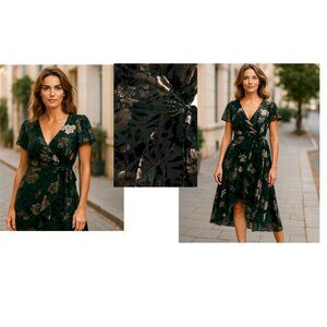 Elegant green midi dress with floral pattern. Features a wrap design and short sleeves. Perfect for any occasion.