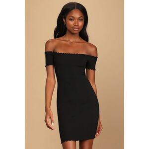 Lulus Exclusive! Years pass and trends may come and go, but one thing's certain: the Lulus Growing Bolder Black Ribbed Off-the-Shoulder Bodycon Dress has the kind of timeless appeal that lasts forever! Stretchy ribbed knit makes up this casual bodycon dress and its off-the-shoulder neckline, short sleeves, and figure-skimming silhouette that falls to a mini hem. Lettuce edge detailing throughout lends that retro-chic vibe we're loving lately!