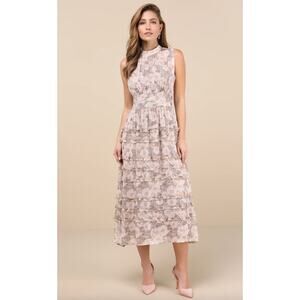 Lulus Happily Sweet Beige Floral Mock Neck Backless Midi Dress Cocktail S NWT