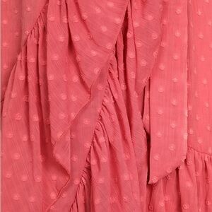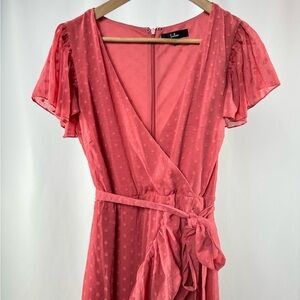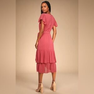 Lulus Have Harmony Swiss Dot Ruffled Faux Wrap Midi Dress in Mauve Size Medium