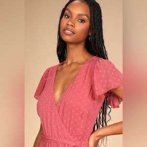 All the lovely details seem to fall right into place when you're wearing the Lulus Have Harmony Mauve Swiss Dot Ruffled Faux Wrap Midi Dress! Crinkly woven chiffon, embellished with textured Swiss dot details, shapes a flirty surplice bodice, framed by sheer fluttery short sleeves. High waist (with a tying sash belt) tops a ruffle-trimmed midi skirt that overlaps at front for a faux-wrap effect. Hidden back zipper/clasp.
