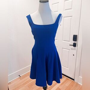 Knit tank straps support a stunning bodice with a sexy square neckline, scoop back, and unique seaming in front. The fun continues with a fit and flare style, thanks to a full circle skirt. Exposed back zipper.