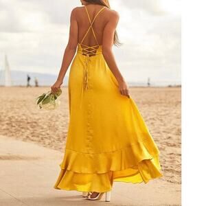 Lulus In Love Forever Maxi Dress Size Small Mustard Yellow Satin Lace-Up Wedding Guest