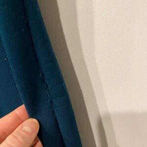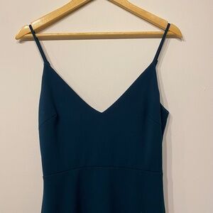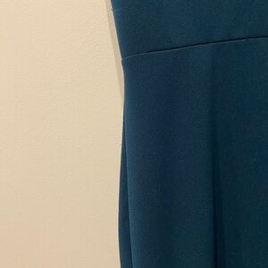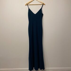 Sleek, stretchy crepe knit shapes this stunning dress with a darted, triangle bodice, adjustable straps, and maxi skirt with flaring mermaid hem. Scoop back with hidden zipper/clasp. The photos make the color look more blue, but it is a dark green. Size is small. There are a couple of small spots of pilling, shown in the photos.