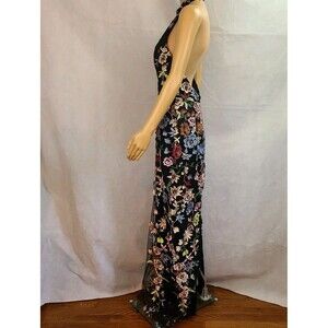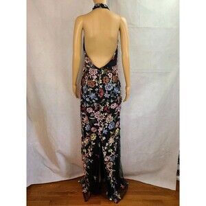 Elegant backless dress with floral design. Features a halter neckline. Perfect for special occasions.