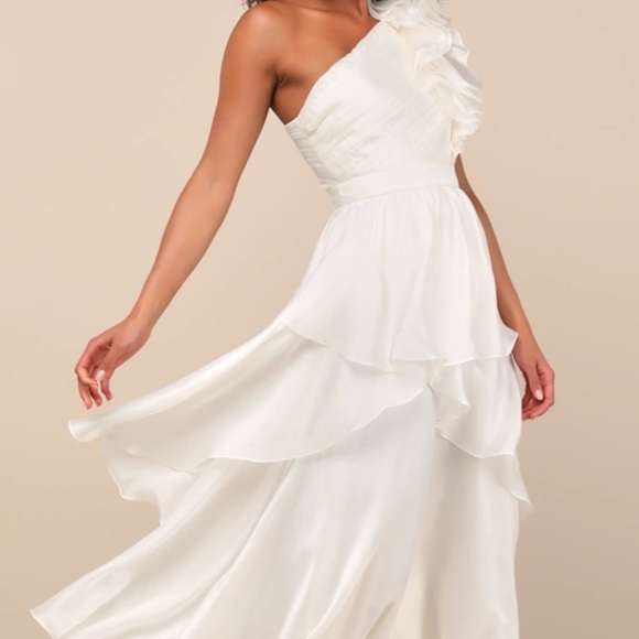 Chic one-shoulder design. Elegant ruffle details. Perfect for special occasions. Ivory